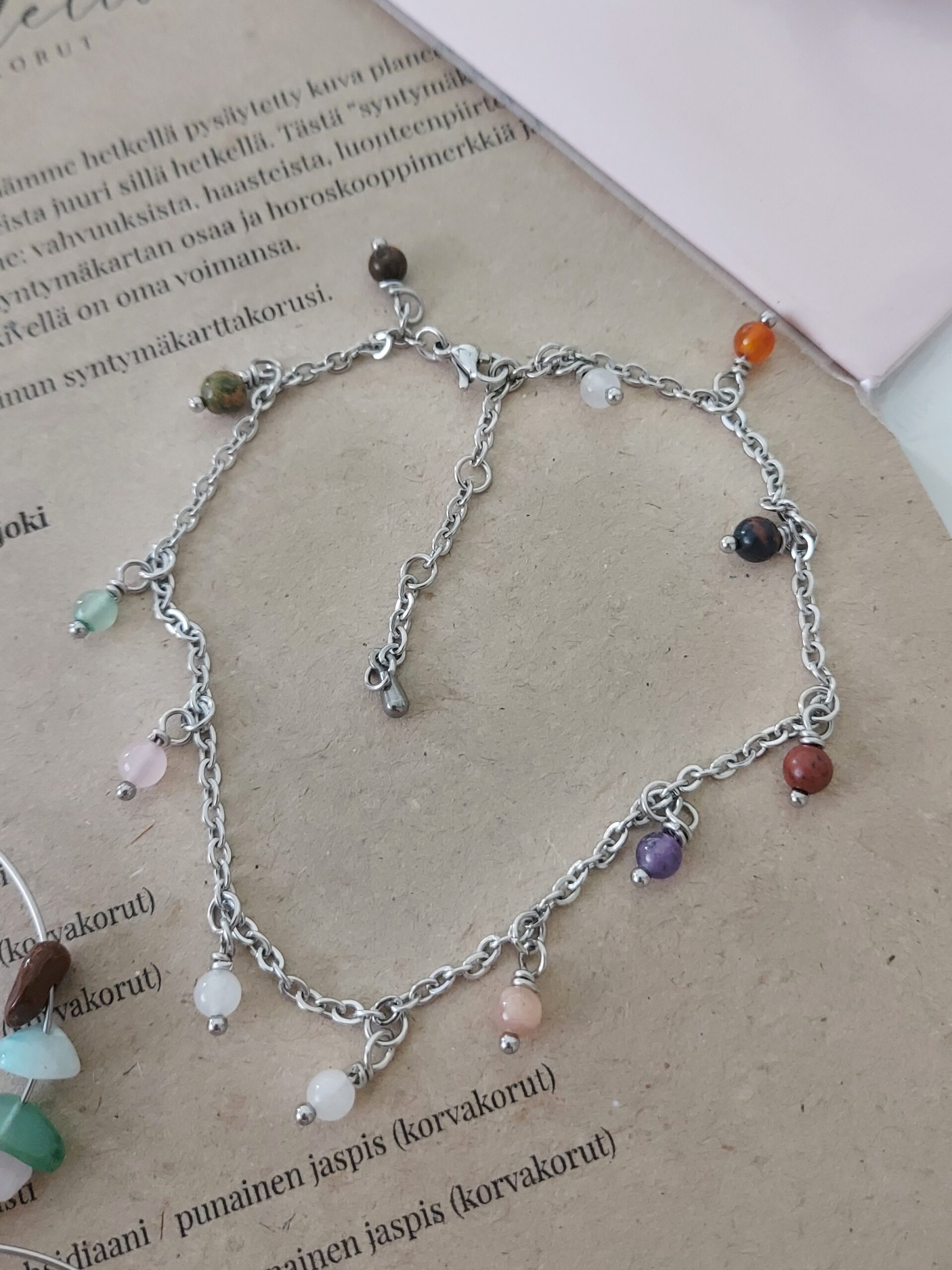 Nilkkakoru oman syntymäkartan pohjalta rakennettuna on merkityksellinen koru, jota haluat pitää aina ylläsi! Jokainen meistä on uniikki ja meillä kaikilla on oma sisäinen voimamme ja energiamme. Näytetään se myös muille! Nilkkakoru roikkuvilla helmillä on kaunis tapa kantaa oman syntymäkartan onnenkiviä mukana, missä kuljetkin. Jokaisen kivihelmen kiinnike on muotoiltu käsityönä.